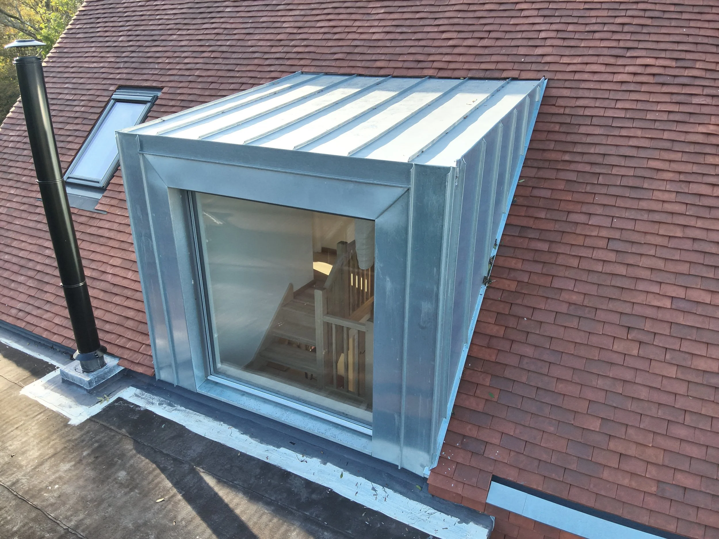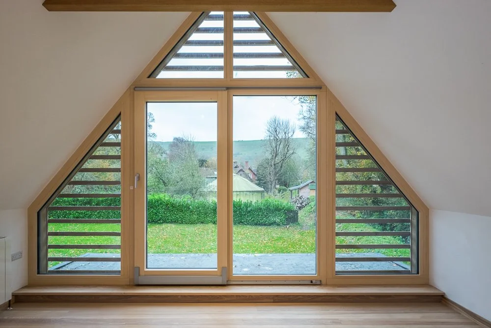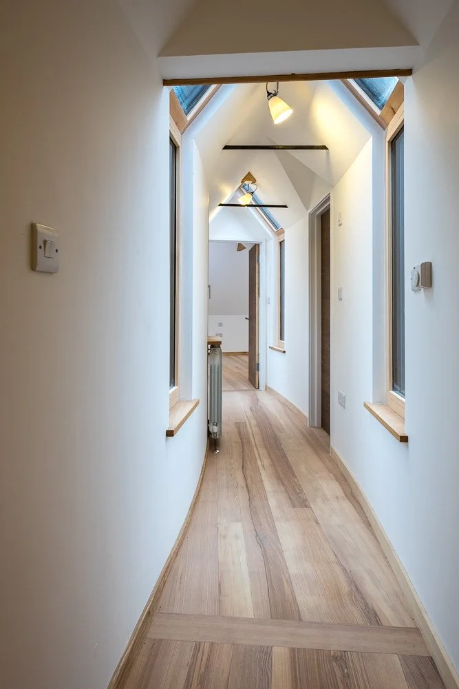 A 1920s bungalow conversion brought up to modern building regs using wood fibre insulation. Brought back to almost just the 4 external walls, the old hipped roof was folded up into gable ends to create more space upstairs. Local Keymer tiles wrap up the walls and over the roof with a natural zinc dormer and window surrounds. Vertical chestnut boarding runs up the two gables ends. English ash runs through the interior with the floor, window seats and an open staircase all showing off the unique colours and grain patterns.