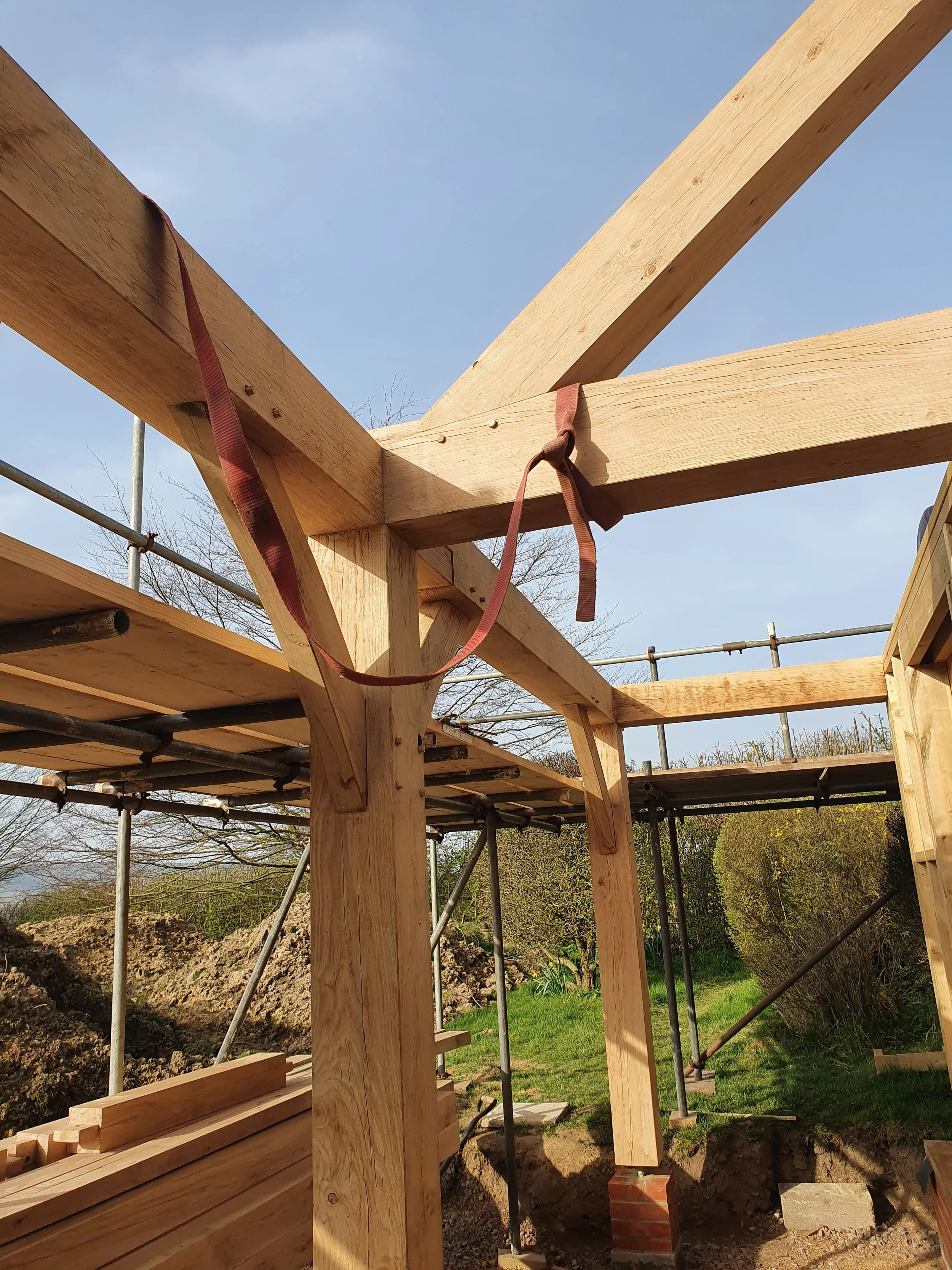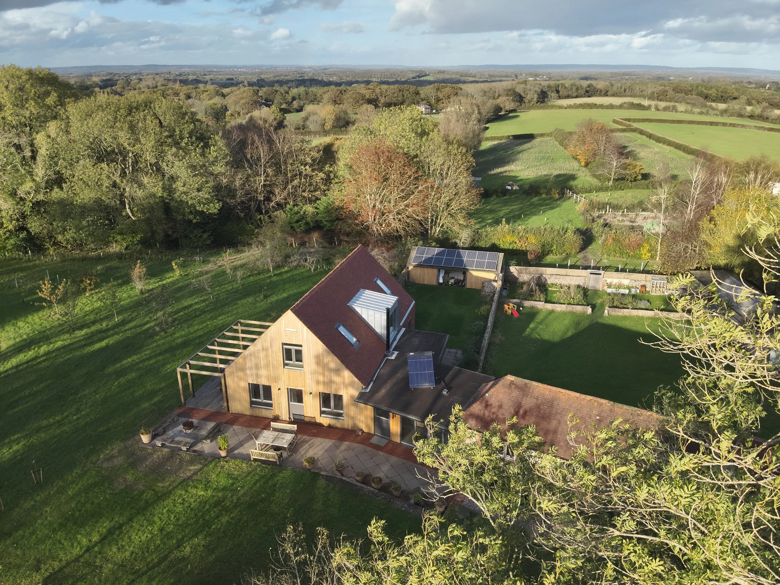 A traditional Oak timber frame, using age old methods of huge mortice and tenons, dovetails and scarfs, all held together with oak pegs. Our favourite wood fibre insulation and solar panels make this a carbon capturing and energy efficient building